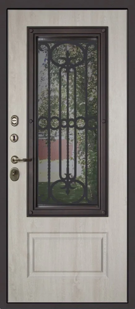 Два слоя покрытия: первый слой - цинкогрунт, второй слой - порошковое покрытие "муар коричневый". Два слоя покрытия. Металлофиленки "Аляска" (2 шт). Тонированный двухкамерный стеклопакет (толщина 3 мм), лазерная резка (рисунок «гранд люкс»)