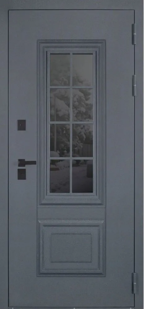Два слоя покрытия: первый слой - цинкогрунт, второй слой - порошковое покрытие. Цвет "букле графит". Декоративный штамп на металле. Порошковое покрытие. Английская решетка. Тонированный стеклопакет